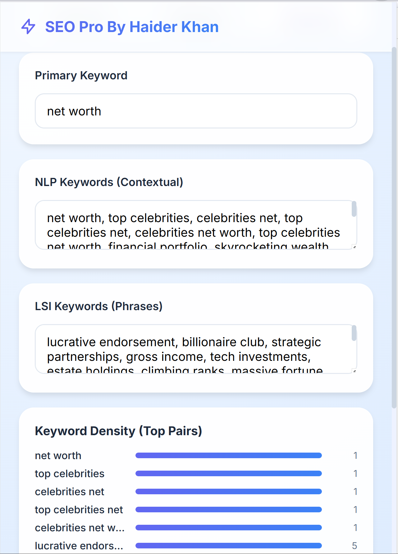 - šĀ Advanced Keyword Extraction:Ā Don’t just look at density. Uncover theĀ NLP (Natural Language Processing)Ā andĀ LSI (Latent Semantic Indexing)Ā terms that Google loves.