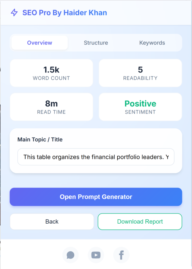 - š¤Ā AI Prompt Generator:Ā Turn extracted data into a powerful, pre-engineered prompt for ChatGPT/Claude. Create content that beats the competition automatically.