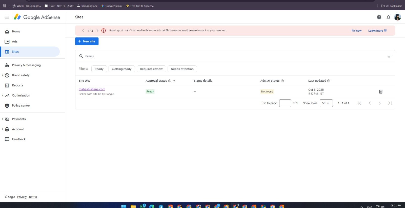 Active AdSense Dashboard Available for Sale | Site Added (Maheshishana.com) | $3 Balance Available